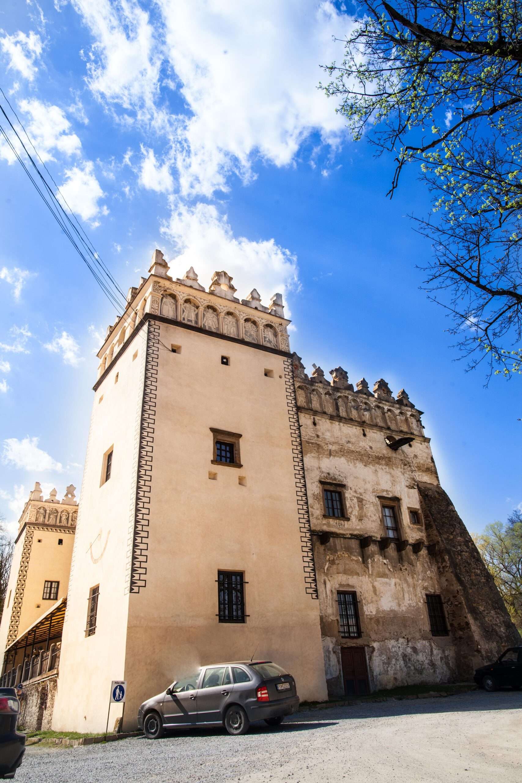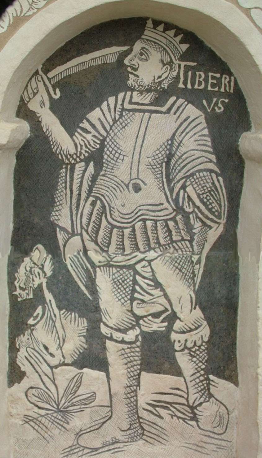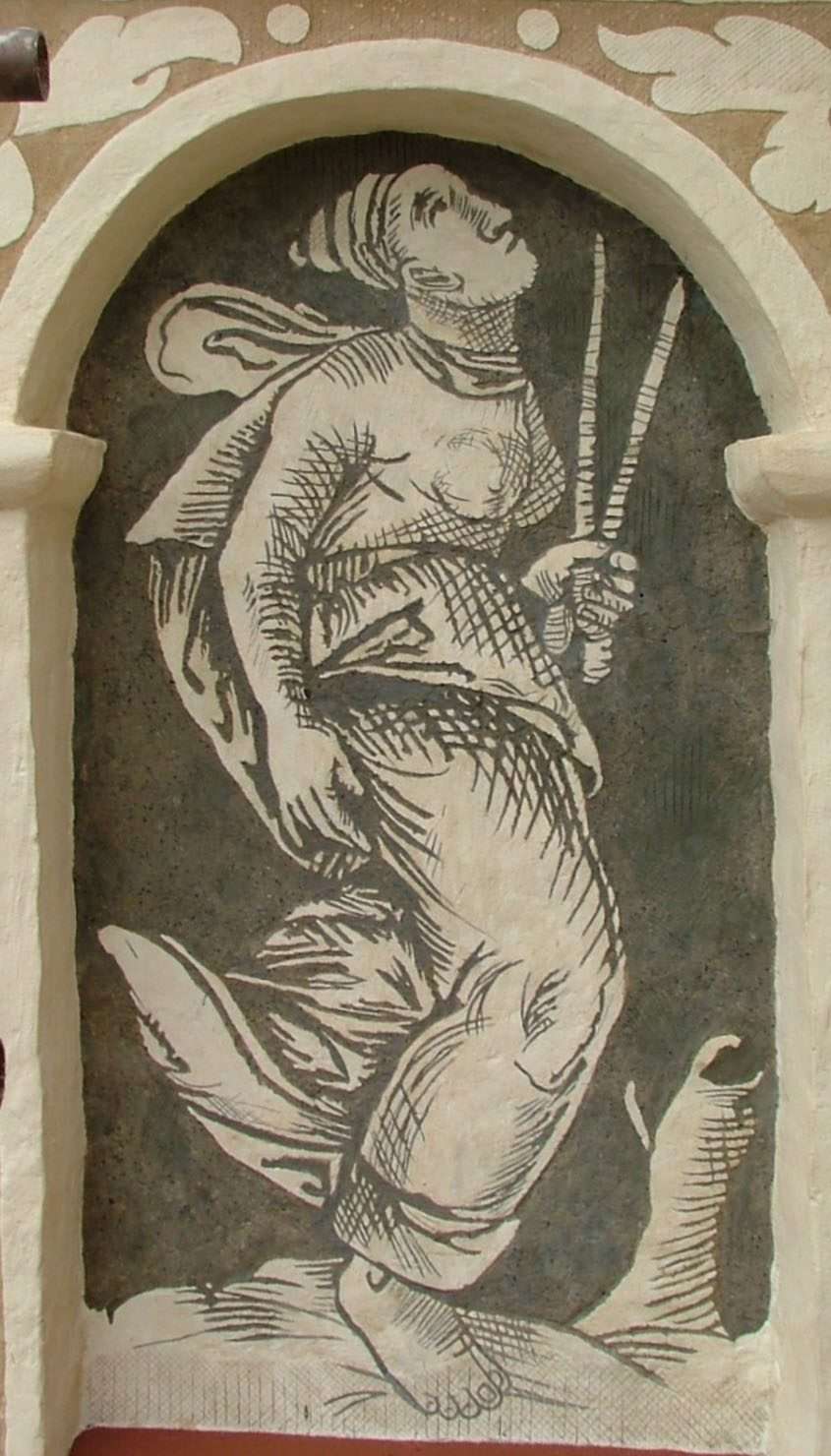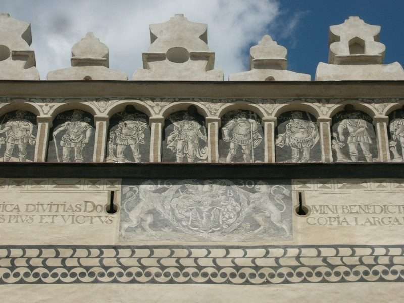 Figurálnu výzdobu vytvoril v roku 1630 Martin Waxman, maliar a sgrafitár pôsobiaci v Uhorsku v 17. storočí. Použil techniku dvojfarebného sgrafita s odtieňmi slonovej kosti a sivočierneho uhlíka.